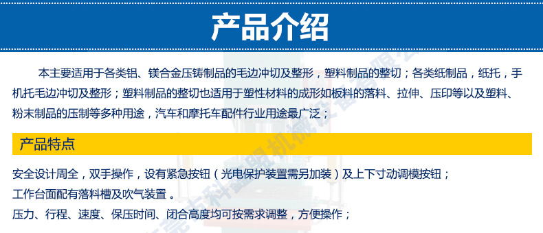 塑料制品的整切也適用于塑性材料的成形如板料的落料、拉伸、壓印等以及塑料、粉末制品的壓制等多種用途,汽車和摩托車配件行業(yè)用途廣泛;